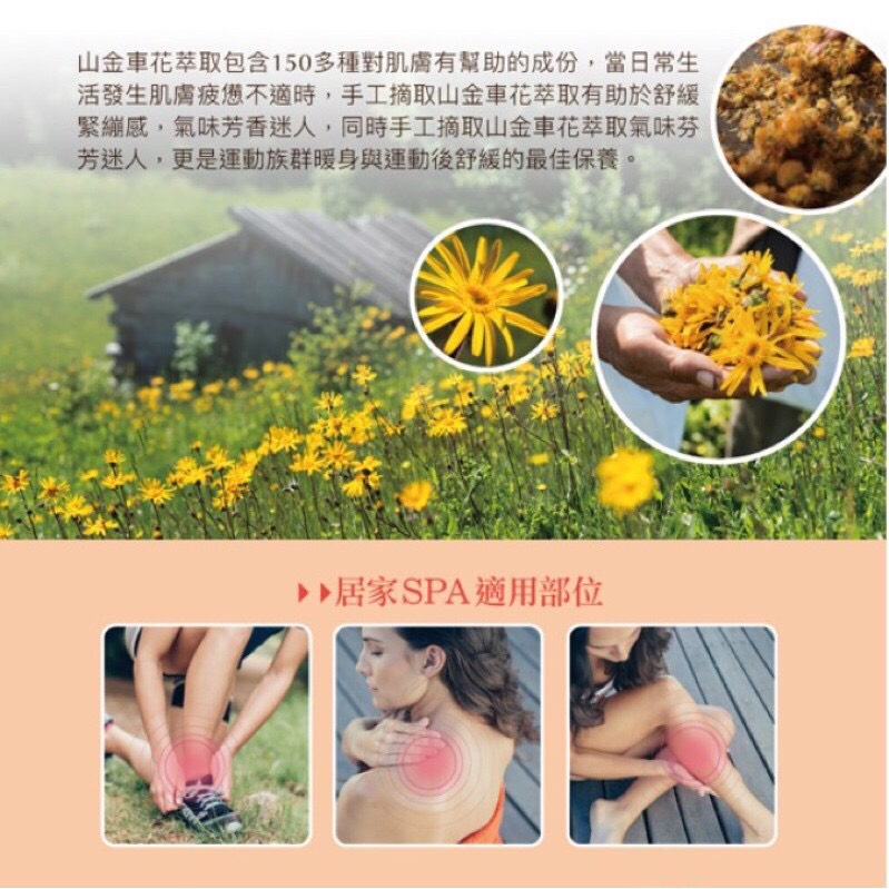 德國人稱之為「山中健康之寶」的山金車油為基底,補充肌膚水份,帶來溫暖的呵護,舒緩肌膚壓力,幫助疲勞的肌膚恢復活力